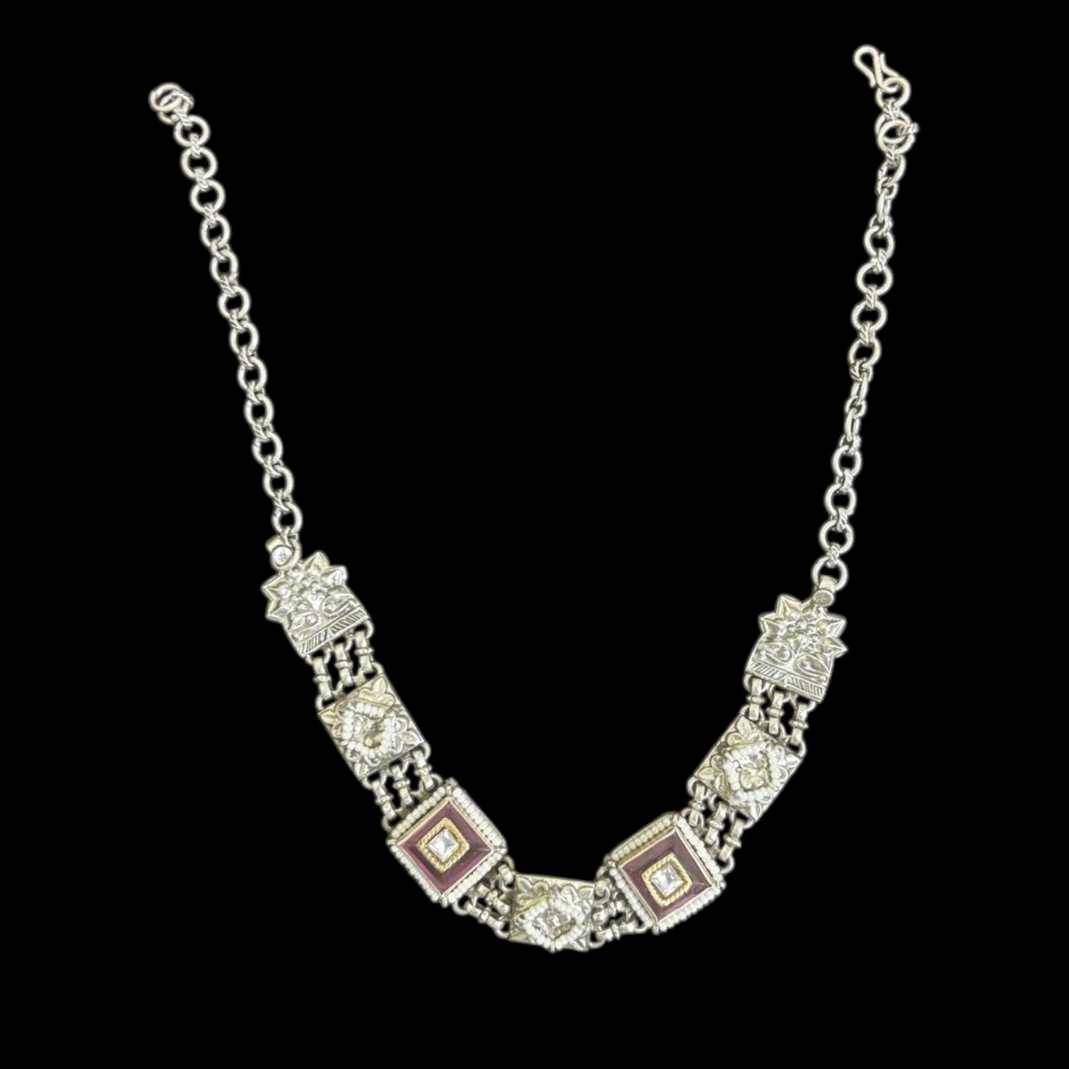 Elevate your ethnic ensemble with this exquisite oxidised silver necklace, showcasing an intricate floral design that captures timeless elegance. Adorned with a lustrous gemstone centerpiece, this piece seamlessly blends traditional craftsmanship with contemporary sophistication. The darkened silver finish adds depth and character, making it an ideal statement accessory for festive occasions or refined everyday wear. A versatile treasure that complements both traditional and modern wardrobes.