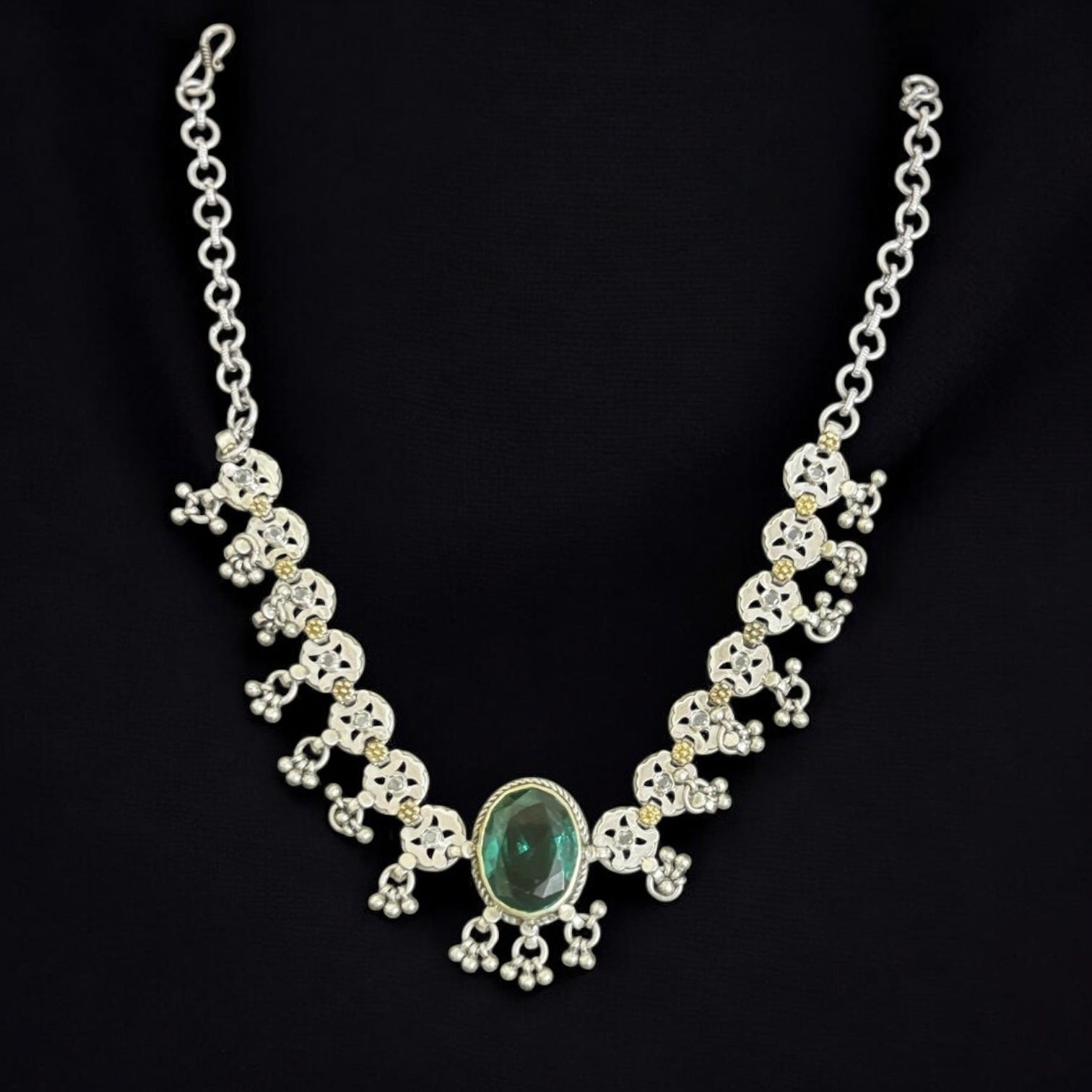 Embrace timeless elegance with this handcrafted emerald necklace, where traditional artistry meets contemporary sophistication. Featuring a lustrous emerald stone set in oxidised 925 sterling silver, this piece captures the regal essence of classical Indian jewellery design. The darkened silver finish adds depth and character, creating a striking contrast that enhances the emerald's natural brilliance. Perfect for special occasions or as a cherished heirloom, this necklace embodies cultural heritage with refined grace.