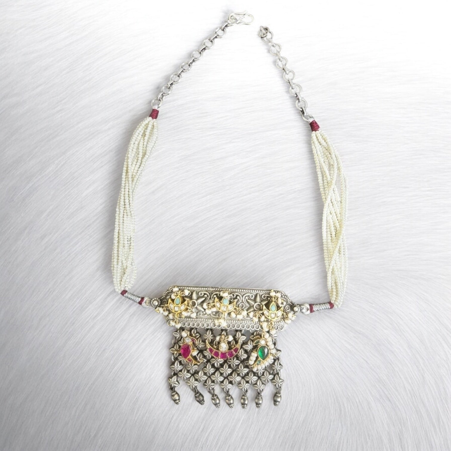Elevate your evening ensemble with this exquisite handmade fusion choker, where traditional craftsmanship meets contemporary design. Meticulously crafted in premium 925 silver, this necklace seamlessly blends classic elegance with modern aesthetics, making it the perfect statement piece for parties and special occasions. The refined choker silhouette flatters the neckline while the intricate detailing showcases artisanal excellence. Versatile enough to complement both traditional and fusion wear, this timeless accessory adds a touch of sophistication to any celebration.
