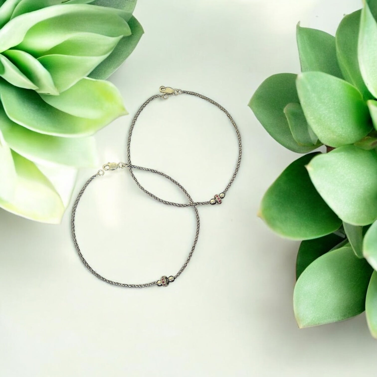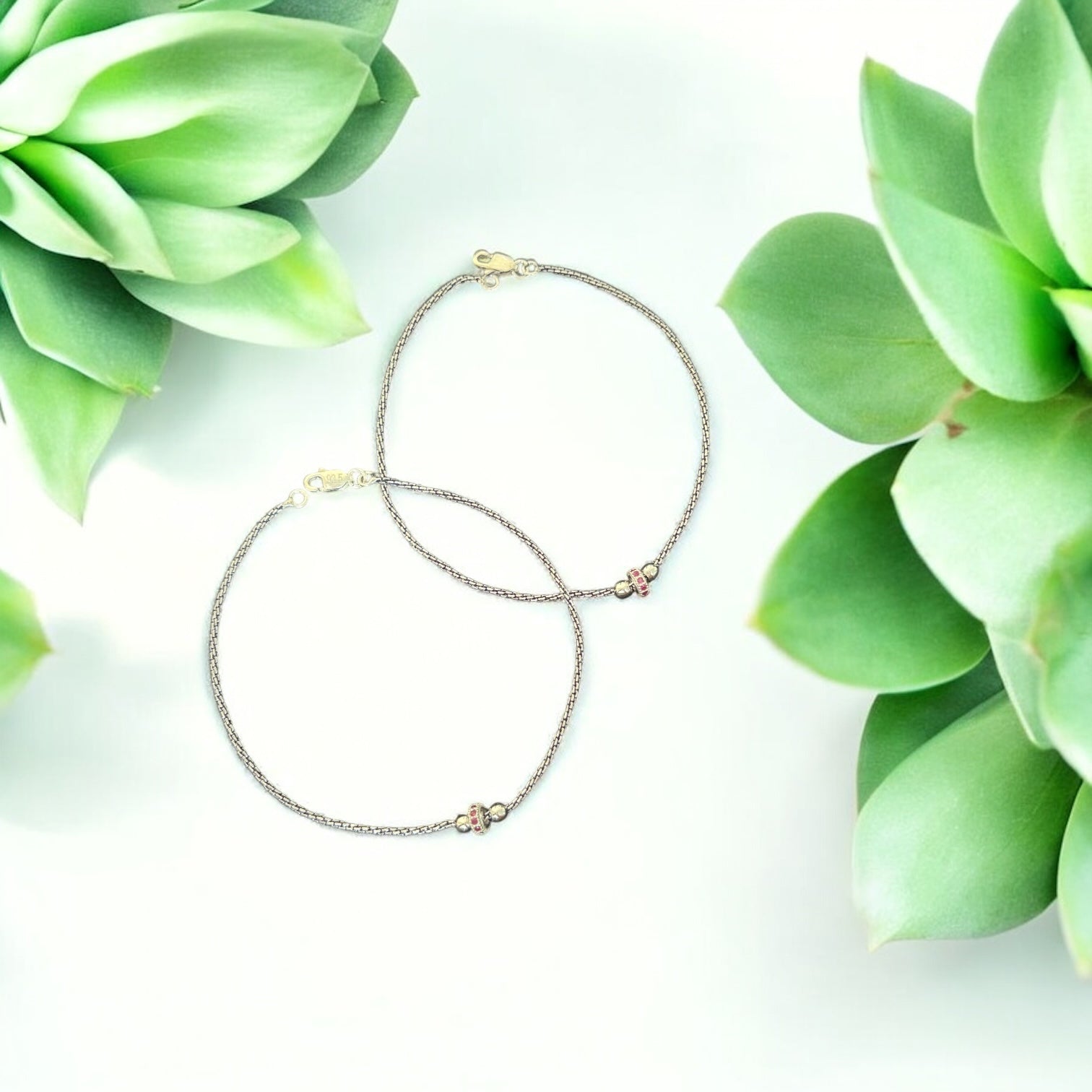 This elegant anklet features a minimal design with striking red beads set against an oxidised silver finish. Its understated charm adds a sophisticated touch to any outfit while the oxidised effect provides a timeless, vintage appeal. Perfect for those who appreciate subtle yet distinctive jewelry.