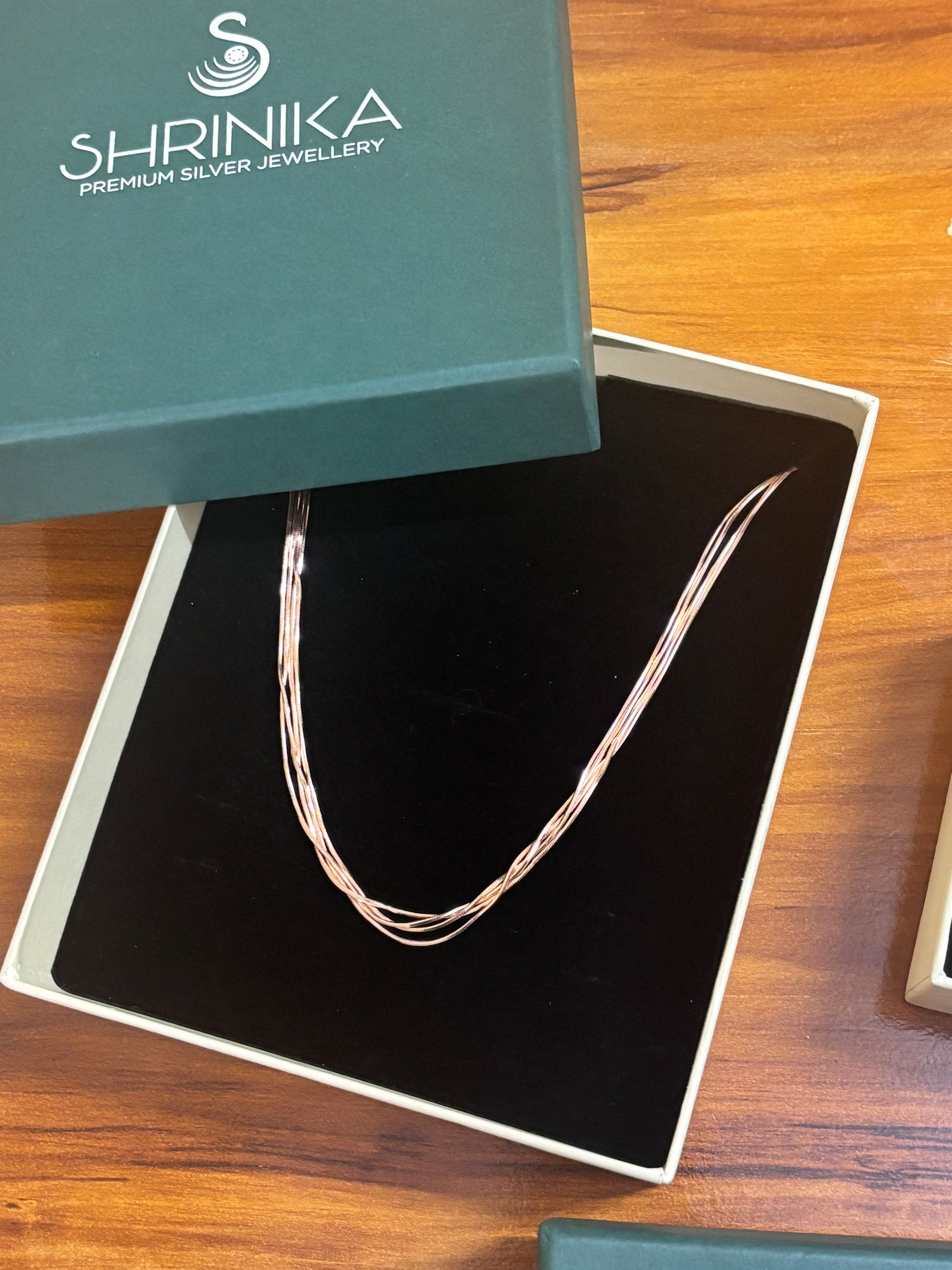 Elevate your jewelry collection with this sophisticated multi-string rose gold silver chain. Its delicate layers offer a refined yet versatile look, perfect for enhancing any outfit from casual to formal occasions. Crafted in premium silver with a rose gold finish, it adds a warm, elegant glow that complements all skin tones and styles effortlessly.